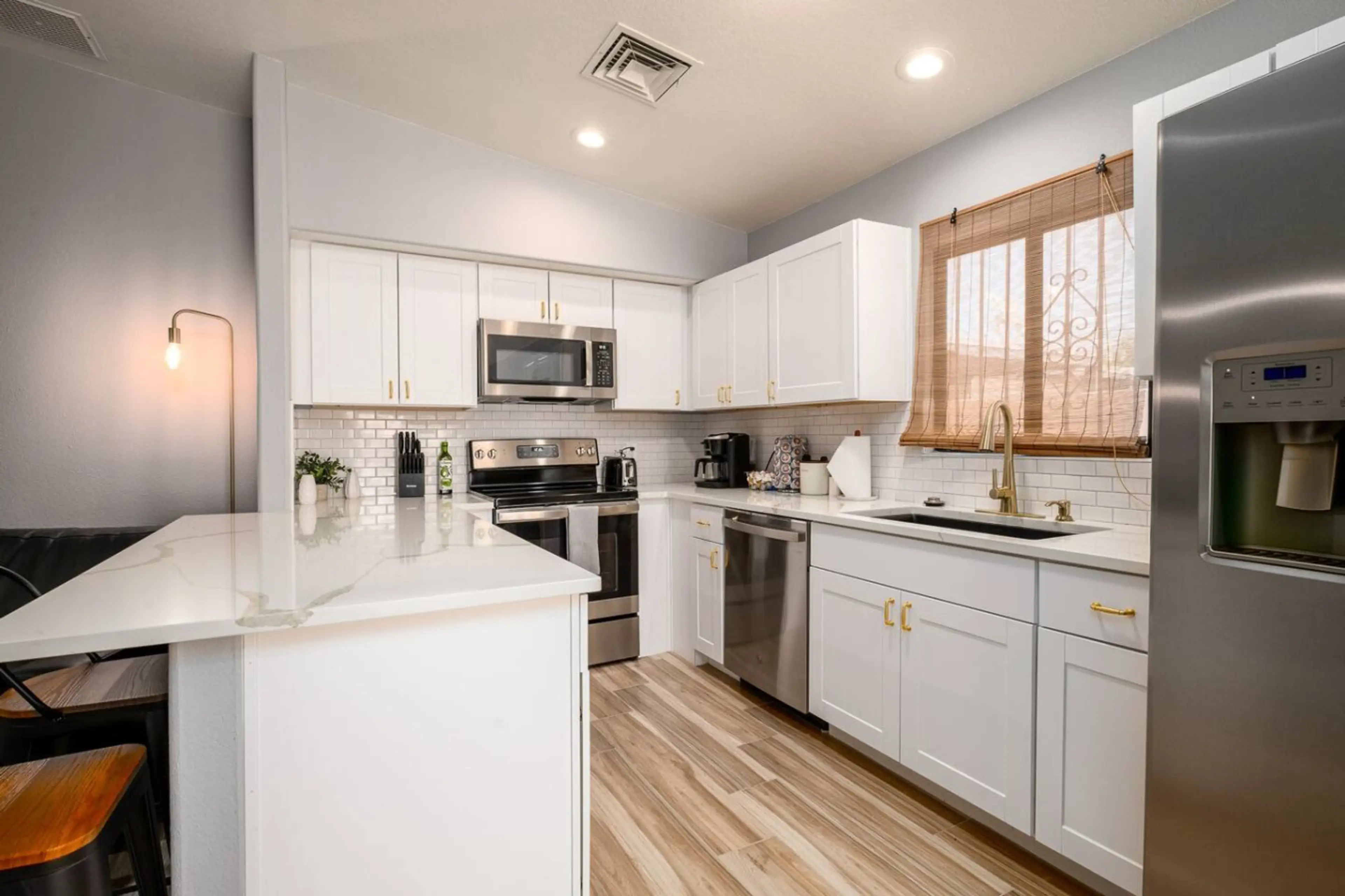 In lock step with other reviewers this is a very nice place to stay. Clean, modern updated, and a fabulous floor plan. Bedrooms separated with 2 King beds, 2 full bathrooms and full kitchen with everything you need. The Kuerig and stocked kcups and creamer is a wonderful touch. It’s the perfect couples getaway stay. Suggestions, try to get there in daylight because it’s on a street corner and GPS doesn’t define which street the front entrance is located and streets are pitch black. Owner was quick responding to inquiries and very simple rules for stay. I might recommend a devices cheat sheet for Thermostat and TV and a little larger dining table, but that aside, we would definitely stay here again when we visit Tucson.